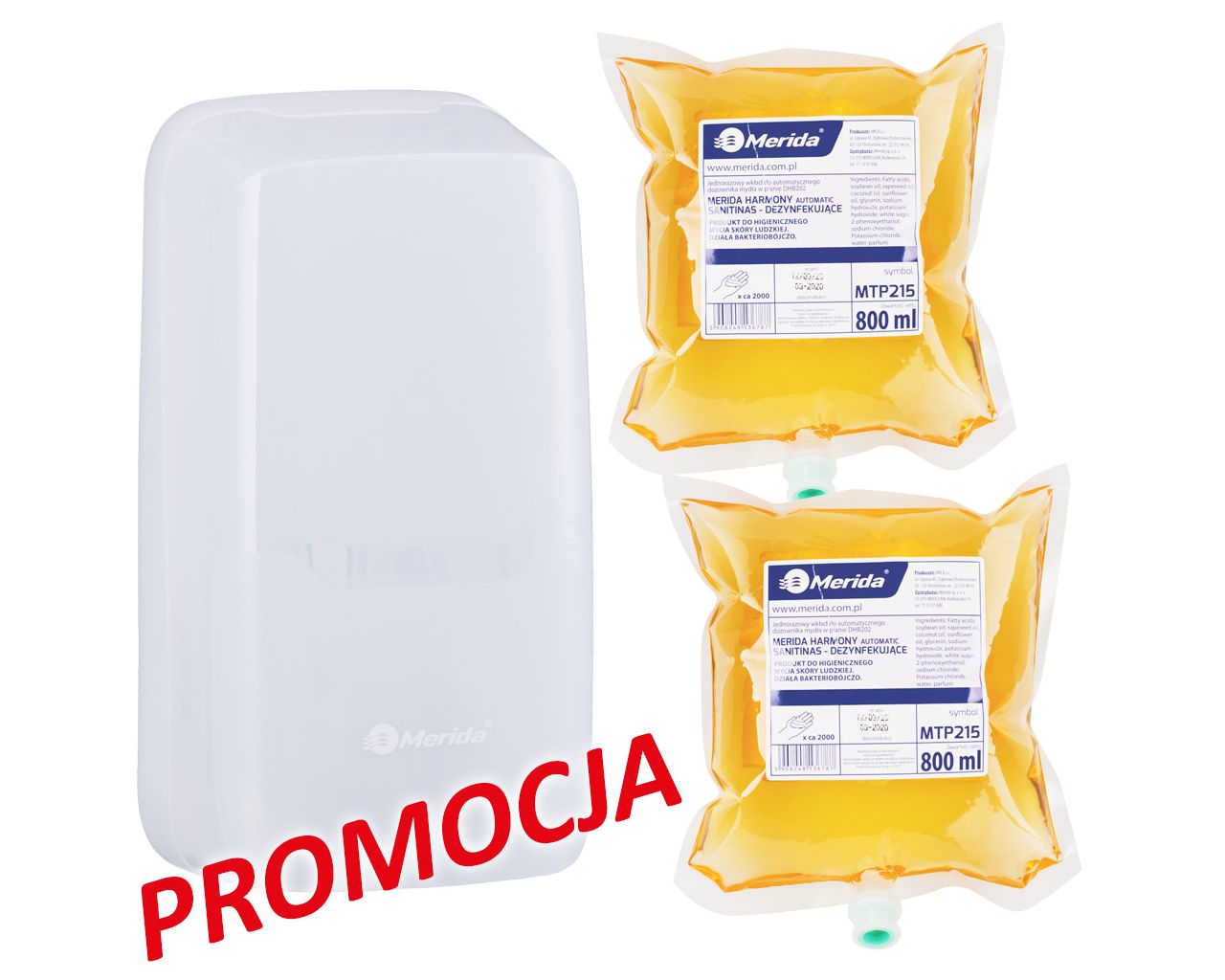 Zestaw Merida Harmony łączy higienę z ekonomią. To kompletny system do mycia rąk: bezdotykowy dozownik mydła w pianie oraz dwa dezynfekujące wkłady Sanitinas Automatic (800 ml, zapach grejpfrutowy).