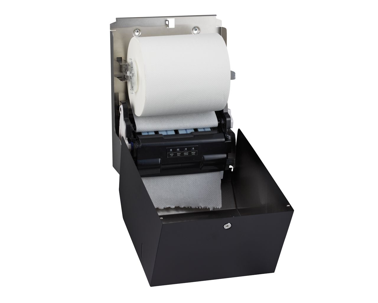 Podajnik ręczników zasilany jest 4 bateriami alkalicznym R20 (baterie dołączone) lub zasilaczem sieciowym. Zasilacz chowany wewnątrz urządzenia w miejscu kasety na baterie, zasilacz można podłączyć bezpośrednio do puszki elektrycznej za urządzeniem (zasilacz kupowany osobno). W urządzeniu łatwo zakłada się nową rolkę papieru z wykorzystaniem wewnętrznego przycisku AUTO FEED do automatycznego nawinięcia papieru na rolki. Diodowy wskaźnik stanu urządzenia, umiejscowiony w dolnej części podajnika, migając na niebiesko sygnalizuje gotowość do pracy, migając na czerwono co 5 sekund sygnalizuje słabe baterie, świecąc stale na czerwono sygnalizuje wyczerpane baterie, migając pulsacyjnie na czerwono sygnalizuje zakleszczenie papieru w urządzeniu. W podajniku jest łatwy dostęp do mechanizmu tnącego umożliwiający bezproblemowe czyszczenie oraz konserwację urządzenia.