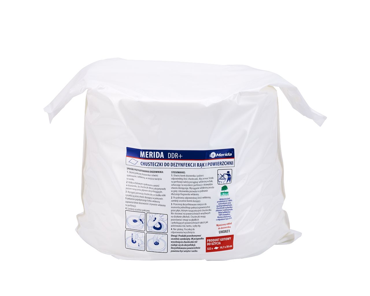 Chusteczki nasączone do chirurgicznej i higienicznej dezynfekcji rąk i powierzchni MERIDA POLANA DDR+wkład uzupełniający do wiadra 10 l, 122,36 m322 listki