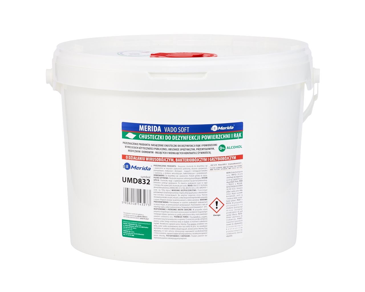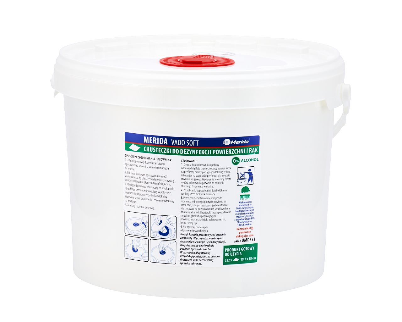 Chusteczki nasączone do dezynfekcji rąk i powierzchni MERIDA VADO SOFTbezalkoholowe, wiadro 10 l, rolka 122,36 m322 listki