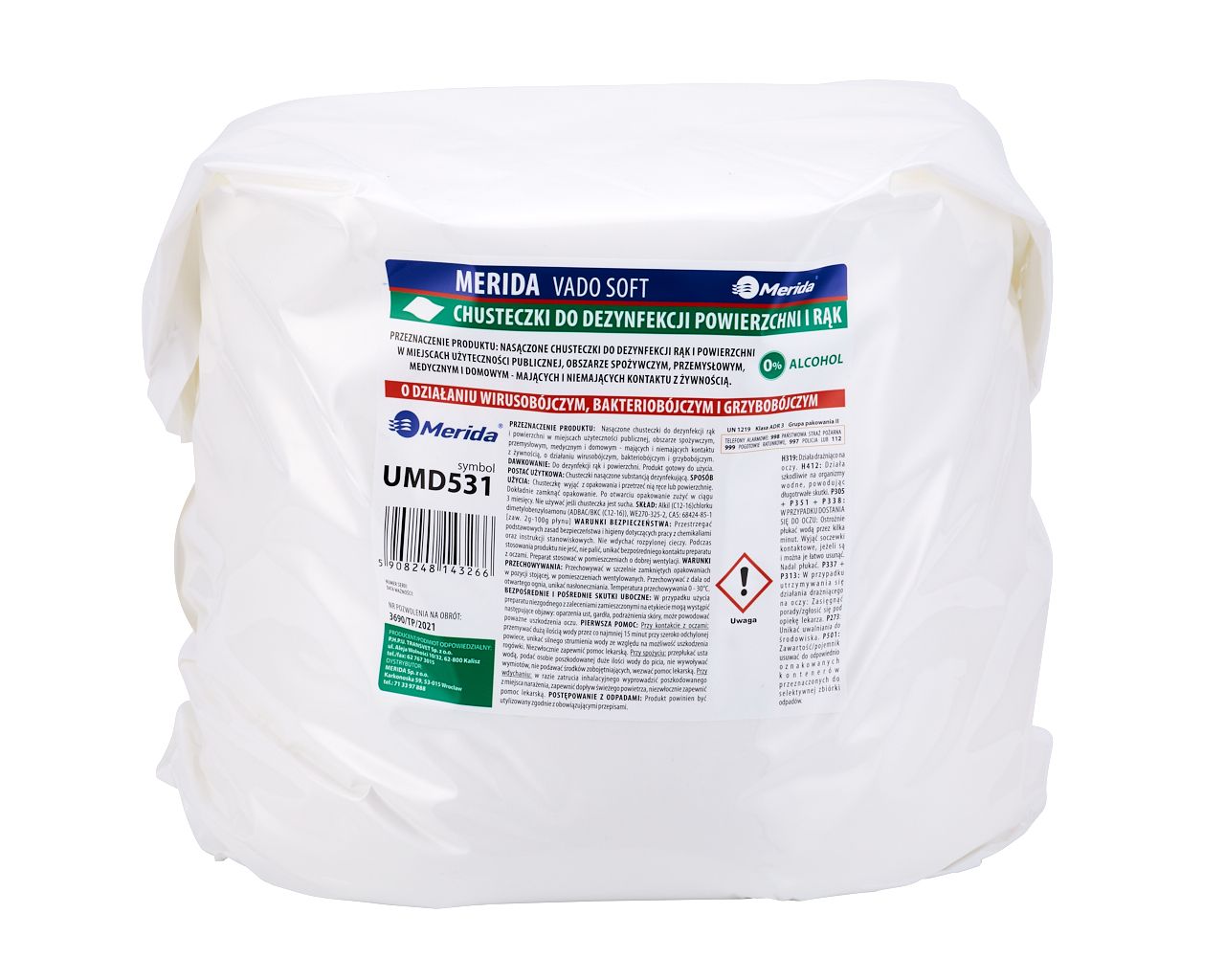 Chusteczki nasączone do dezynfekcji rąk i powierzchni MERIDA VADO SOFTbezalkoholowe, wkład uzupełniający do wiadra 10 l, rolka 122,36 m322 listki