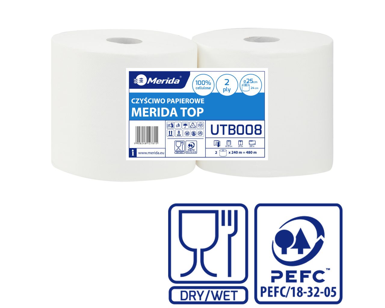 Czyściwo papierowe MERIDA TOP 25 (UTB008) to wydajne czyściwo przemysłowe w roli do codziennej pracy tam, gdzie sprzątasz szybko i często: produkcja, warsztat, magazyn, serwis, utrzymanie ruchu, sprzątanie techniczne oraz zaplecza sanitarne. Jest wykonane z 100% celulozy, ma 2 warstwy i gofrowanie, dzięki czemu dobrze chłonie i jest bardziej odporne na rozrywanie podczas intensywnego przecierania. Rolka ma 240 m długości i perforację co 30 cm, więc łatwo dozujesz papier i ograniczasz straty. W opakowaniu dostajesz 2 rolki, czyli praktyczny zapas na stanowisko.
