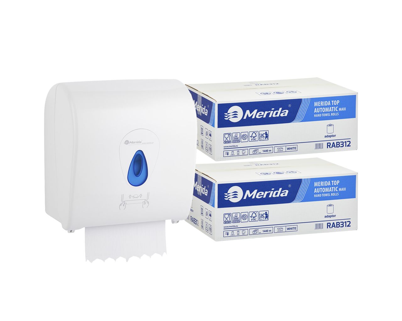 Mechaniczny podajnik ręczników MERIDA TOP niebieski za 100 zł netto przy zakupie 2 kartonów ręczników MERIDA TOP AUTOMATIC RAB312 (12 x 240 m = 2 800 m10 656 listków)