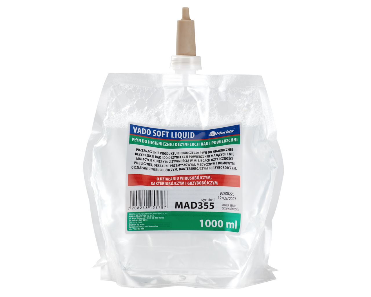 MERIDA VADO SOFT bezalkoholowy płyn do higienicznej dezynfekcji rąk i powierzchnijednorazowy wkład 1000 ml