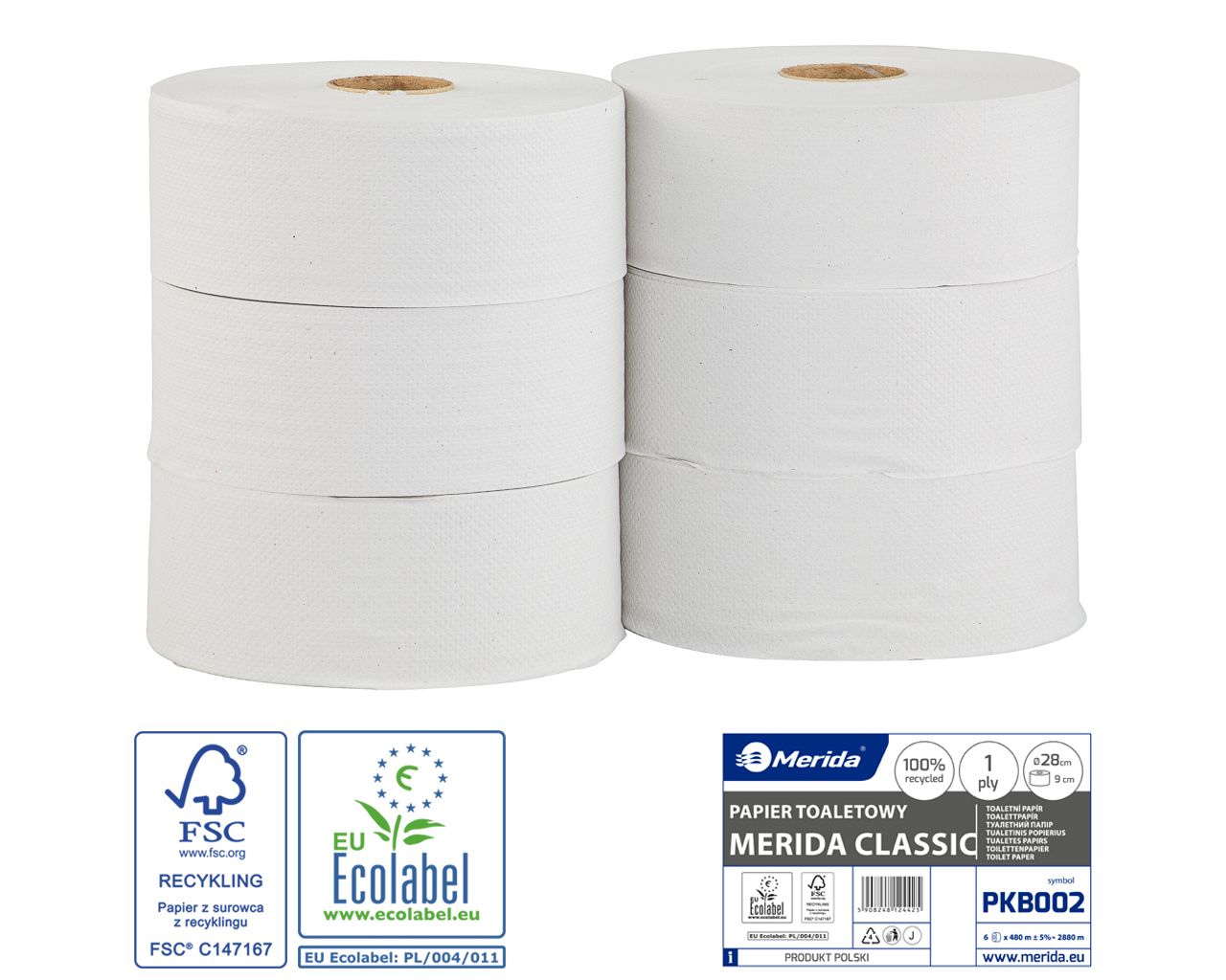 Papier toaletowy MERIDA CLASSIC biały, średnica 28 cm, długość 480 m, jednowarstwowy, zgrzewka 6 szt.ECOLABEL