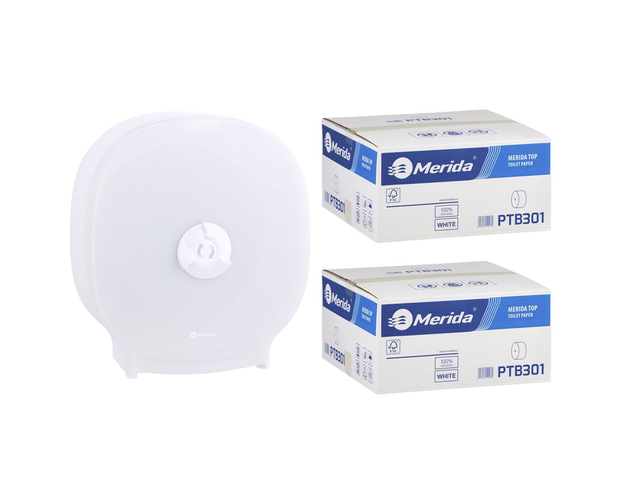 Pojemnik na cztery rolki papieru toaletowego bez gilzy MERIDA HARMONY za 75 zł netto przy zakupie 2 kartonów papiery toaletowego MERIDA TOP PTB301 (36 x 85 m = 3060 m12 240 listków)