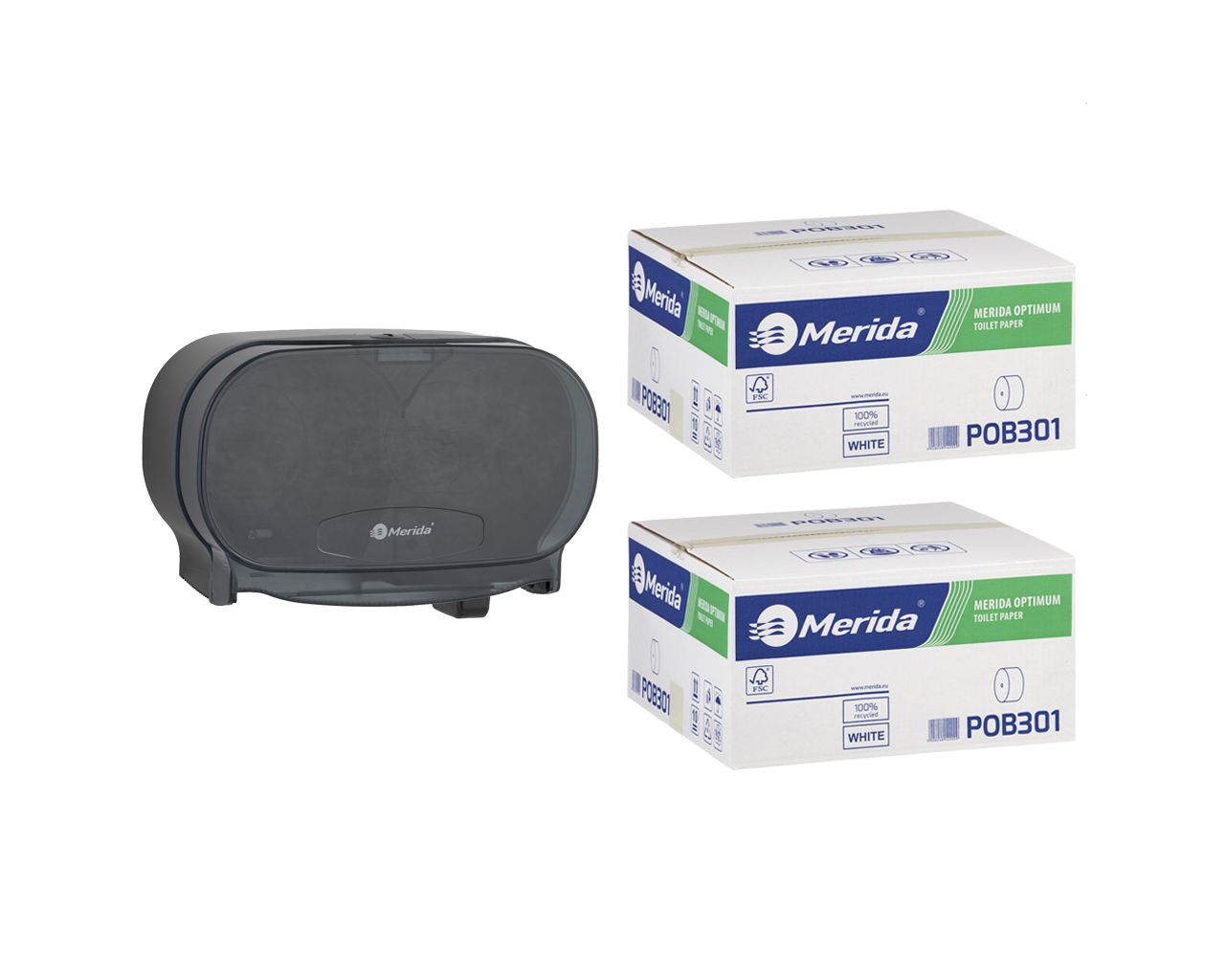 Pojemnik na dwie rolki papieru toaletowego bez gilzy MERIDA ONE czarny za 50 zł netto przy zakupie 2 kartonów papiery toaletowego MERIDA OPTIMUM POB301 (36 x 85 m = 3060 m12 240 listków)