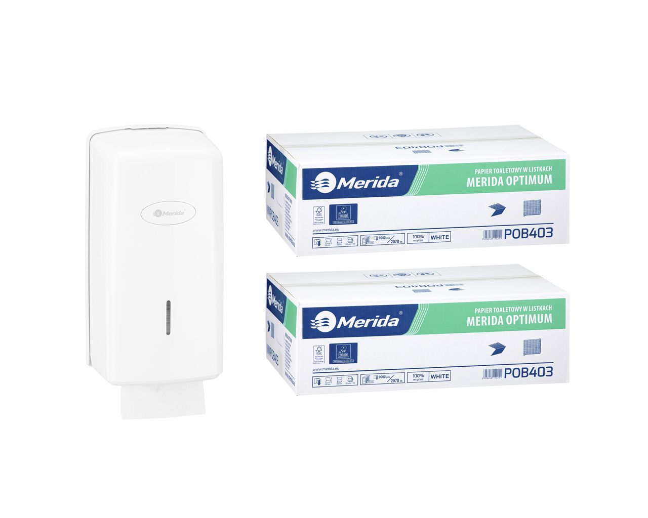 Pojemnik na papier toaletowy w listkach MERIDA ONE za 1 zł netto przy zakupie 2 kartonów papierów toaletowych MERIDA OPTIMUM POB403 (18 000 listków)