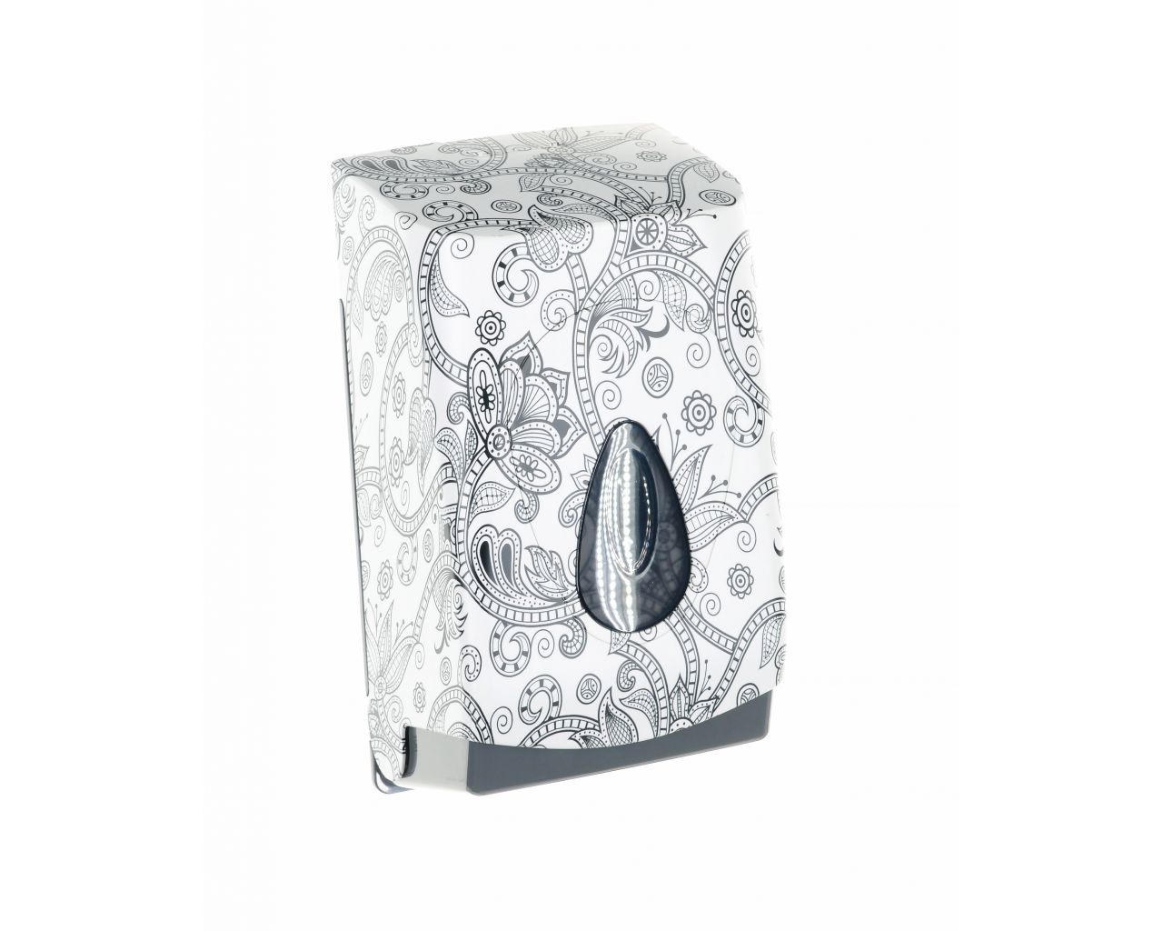 Pojemnik wykonany z wysokiej jakości tworzywa ABS o pojemność do 400 szt. listków papieru. Dostosowany do użytkowania z papierem toaletowym w listkach. Zaopatrzony w ozdobne, ciemnoszare okienko umożliwiające kontrolę ilości papieru w pojemniku. Odporny na działanie UV. Pojemnik zamykany na kluczyk.