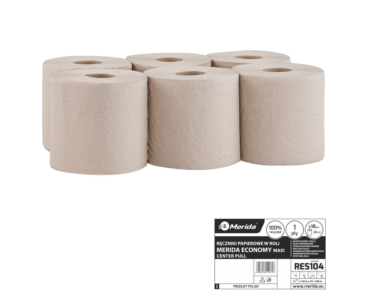 Ręczniki papierowe w roliMERIDA ECONOMY CENTER PULL MAXI, jednowarstwowe, szare, średnica 19 cm, długość 135 mzgrzewka 6 rolek