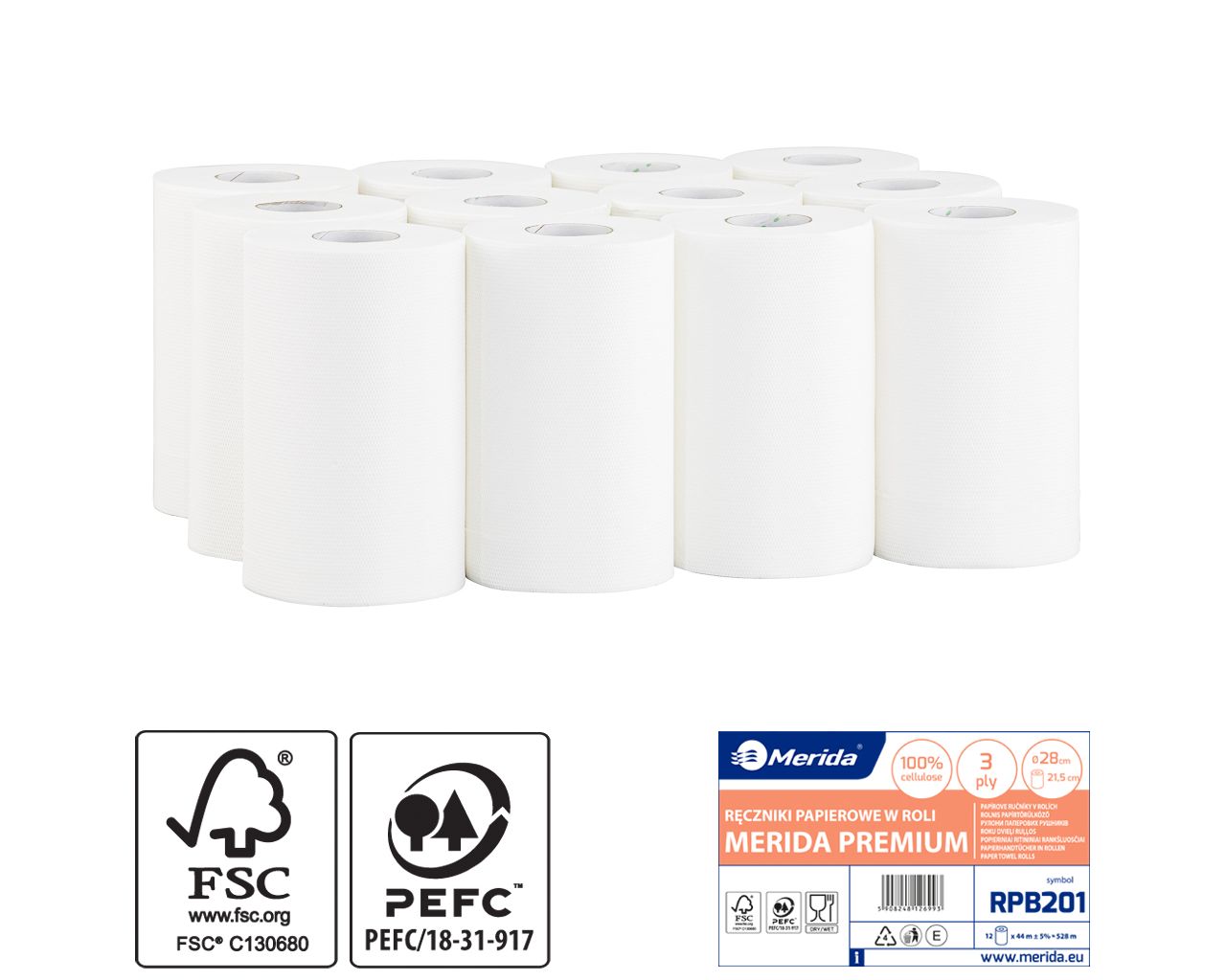 Ręczniki papierowe w roli MERIDA PREMIUM MINIbiałe, średnica 13 cm, długość 44 m, trzywarstwowezgrzewka 12 rolek