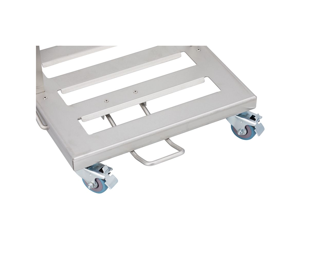 – wyposażony w 4 kółka łożyskowe o średnicy 50 mm w tym 2 z hamulcem w dwóch osiach, opony gumowe niebrudzące posadzki