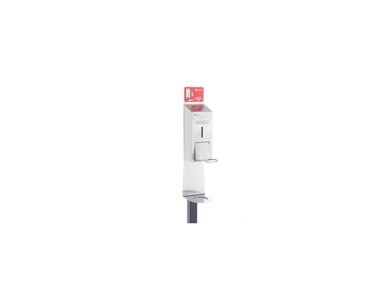 – szyld mocowany bezpośrednio do stojaka, wykonany ze stali nierdzewnej szczotkowanej (matowej), specjalnie wyprofilowany w dolnej części tworzy tackę chroniącą przed przypadkowym zachlapaniem podłogi