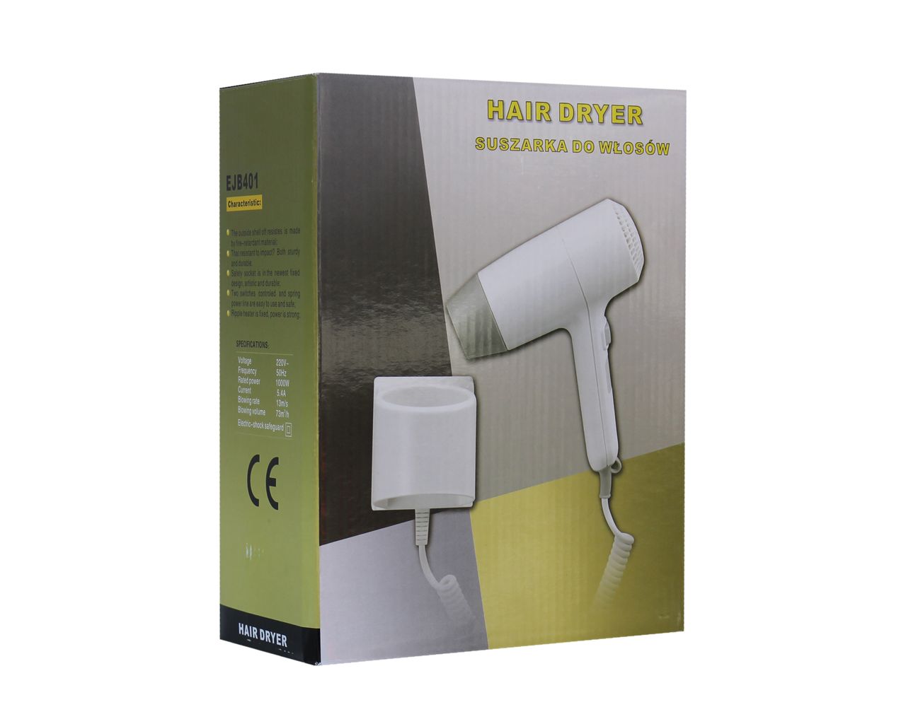 Elegancka suszarka do włosów, wykonana z wytrzymałego tworzywa sztucznego. Przeznaczona do stosowania w łazienkach domowych, hotelowych, w pensjonatach itp. Posiada włącznik z możliwością ustawienia mocy i prędkości wypływu powietrza. Suszarka posiada w komplecie uchwyt ścienny, który umożliwia jej zawieszenie. W uchwycie znajduje się wyłącznik, który powoduje automatyczne wyłączenie suszarki po jej odwieszeniu. Suszarka wyposażona jest w przewód zasilający z wtyczką, daje to możliwość bardzo łatwego montażu.