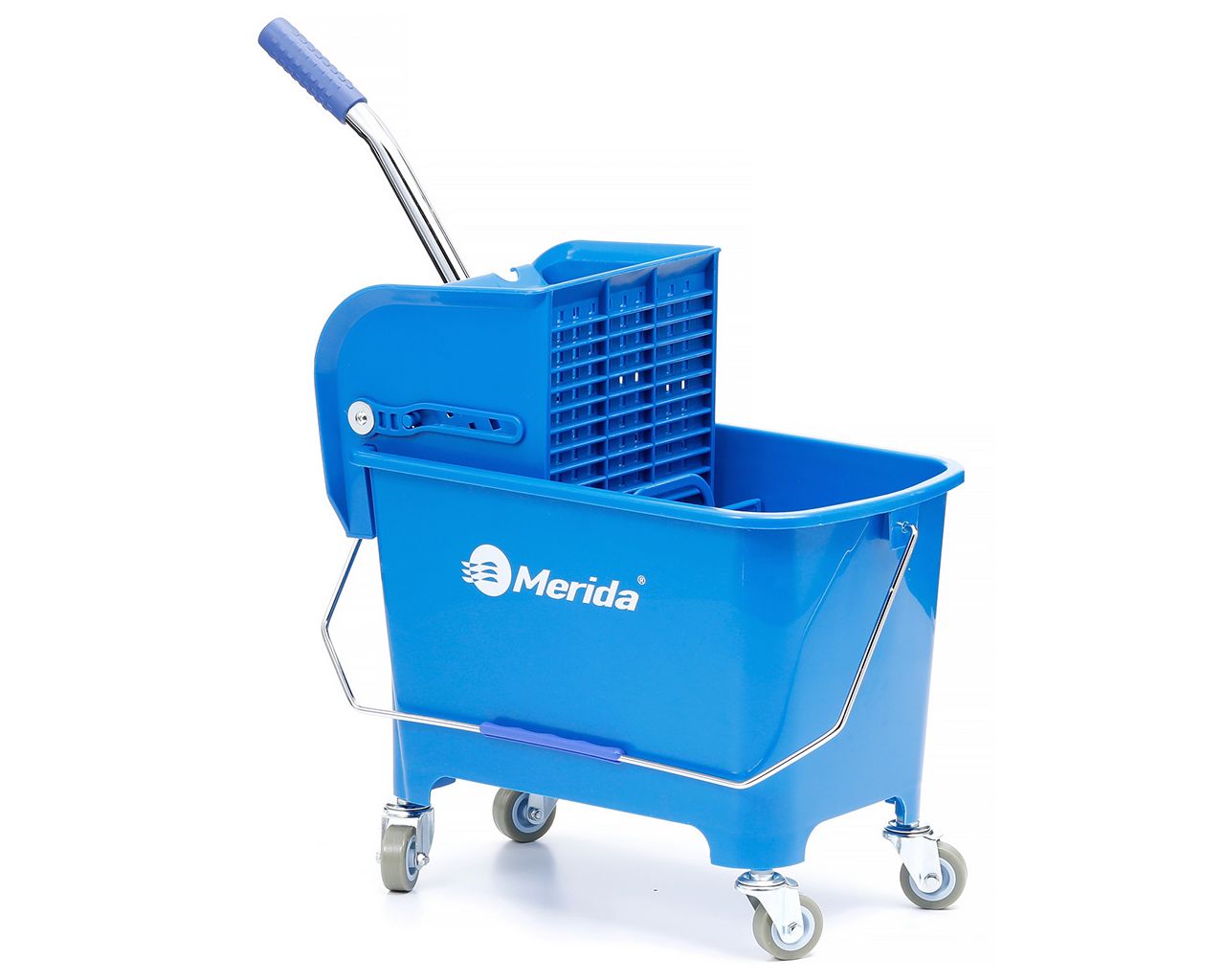 Wózek z wiadrem o pojemności 20 litrów. Posiada niezwykle skuteczną, płytową prasę do mopów. Wózek wyposażony jest w samoskrętne kółka, ułatwiające pracę. Dostępny w kolorze niebieskim. Doskonale nadaje się do mycia niewielkich powierzchni.