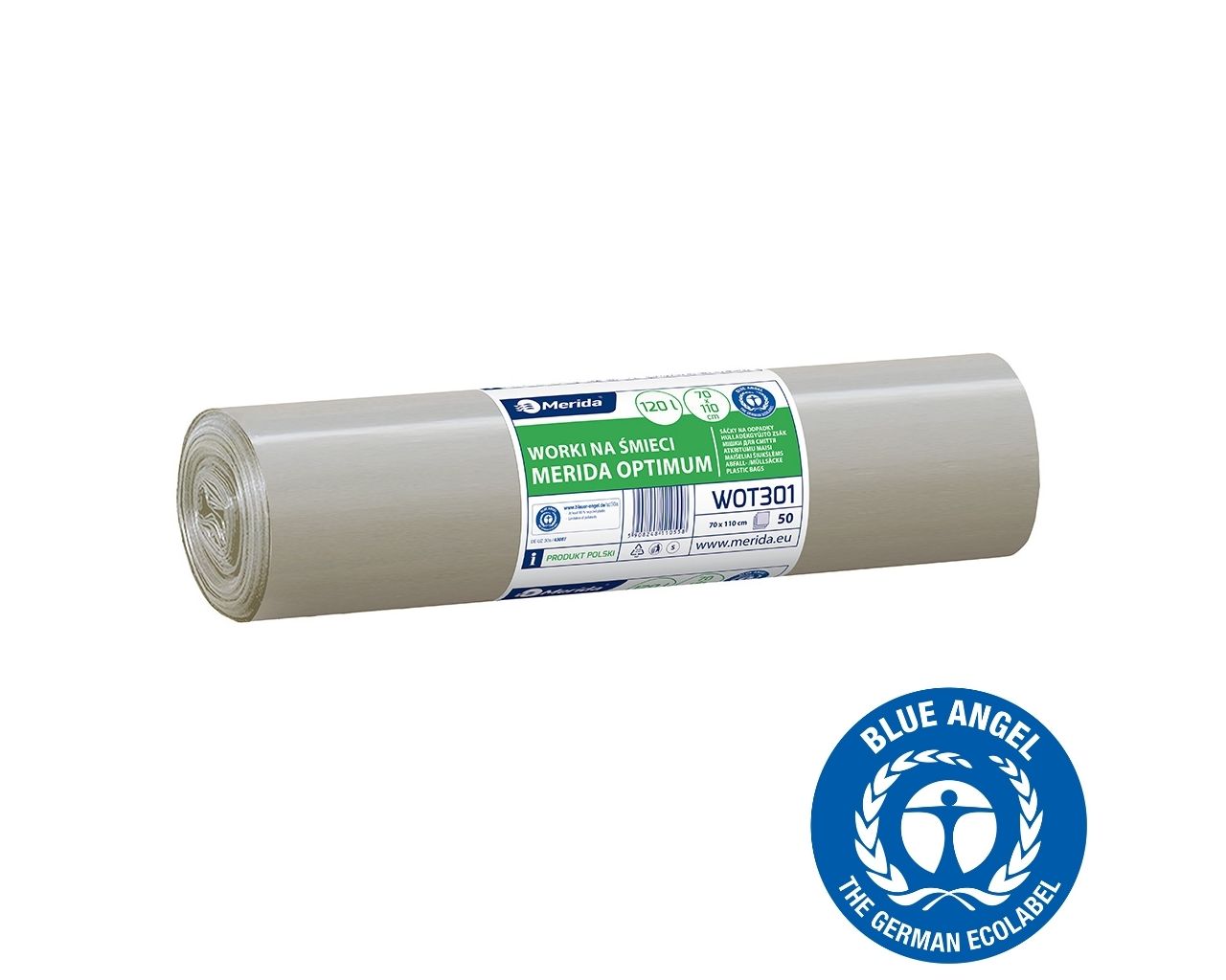 Worki na śmieci 120 lMERIDA OPTIMUM BLUE ANGEL, bezbarwne, 70×110 cmrolka 50 szt.