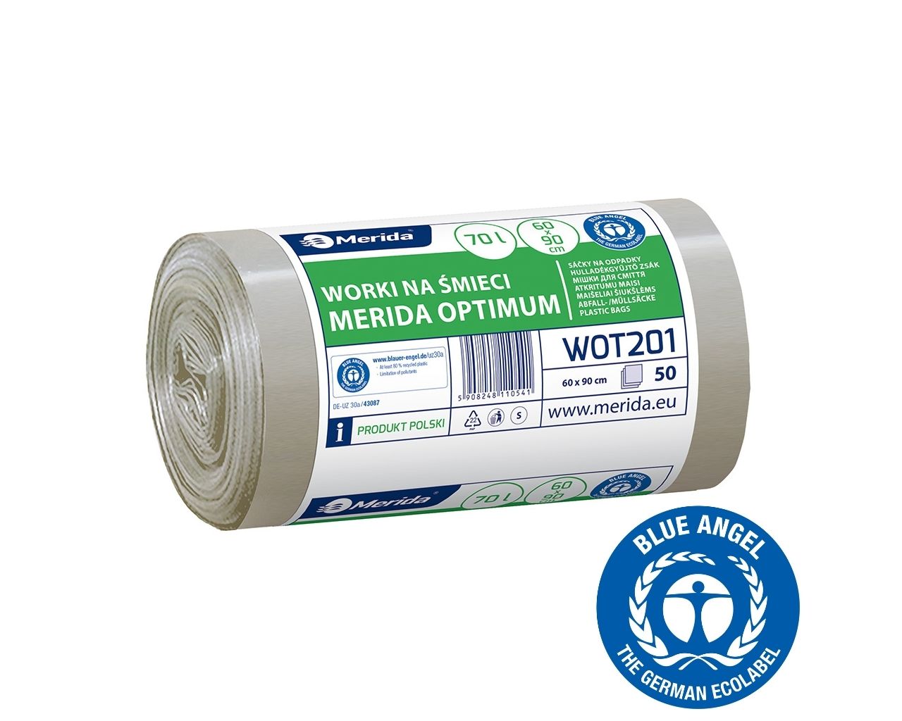 Worki na śmieci 70 lMERIDA OPTIMUM BLUE ANGEL, bezbarwne, 60×90 cmrolka 50 szt.