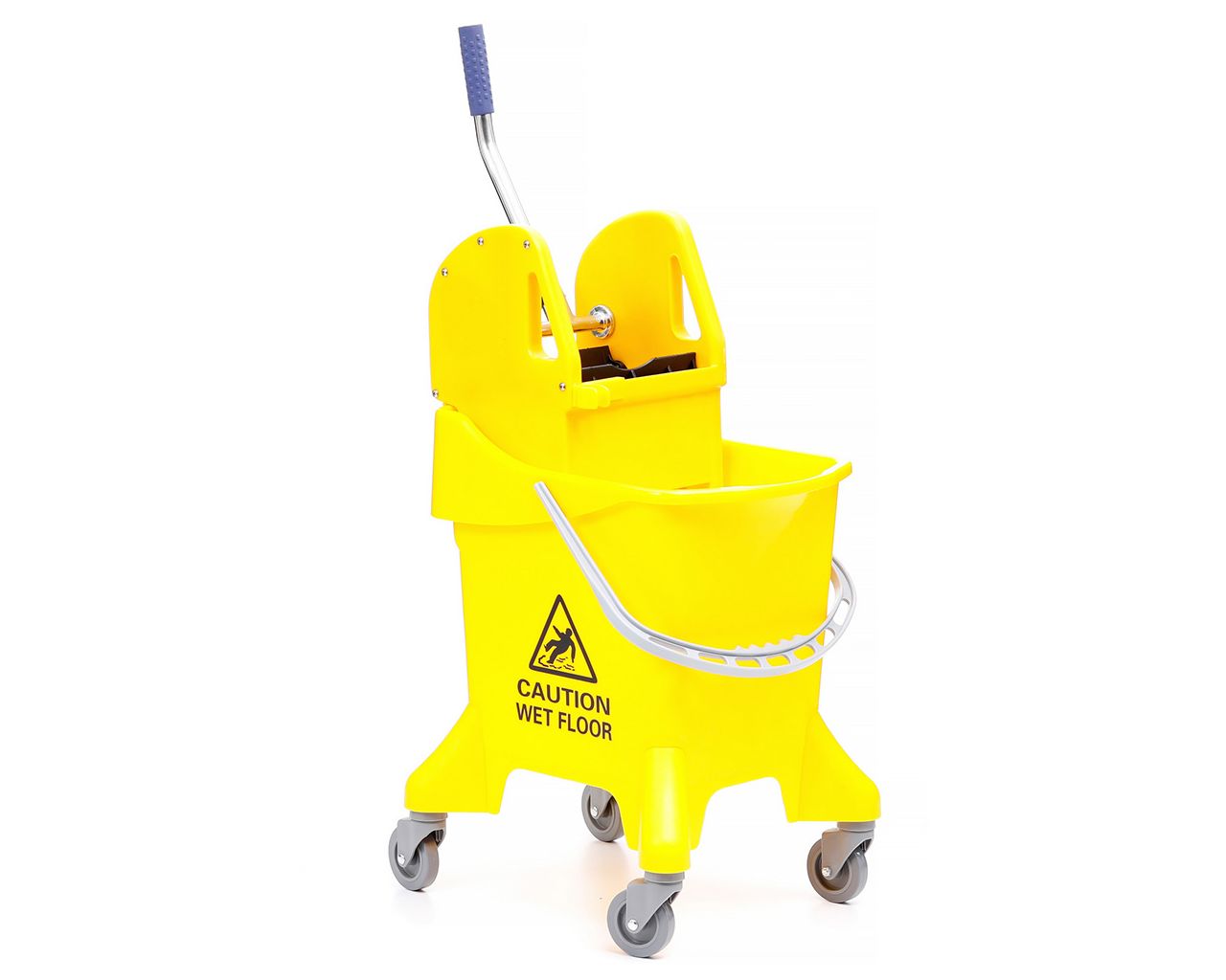 Wózek wykonany z trwałego i mocnego tworzywa sztucznego. Posiada szeroko rozstawione, duże kółka, które zapewniają stabilność i komfort podczas pracy. Wózek jest w kolorze żółtym, posiada dodatkowo piktogram i napis ostrzegający o mokrej podłodze. Wiadro, o pojemności 31 litrów, posiada ergonomiczny kształt, ułatwiający wylewanie cieczy. Zestaw posiada przesuwany uchwyt na kij. Prasa wózka przystosowana do pracy ze stelażami i mopami płaskimi.