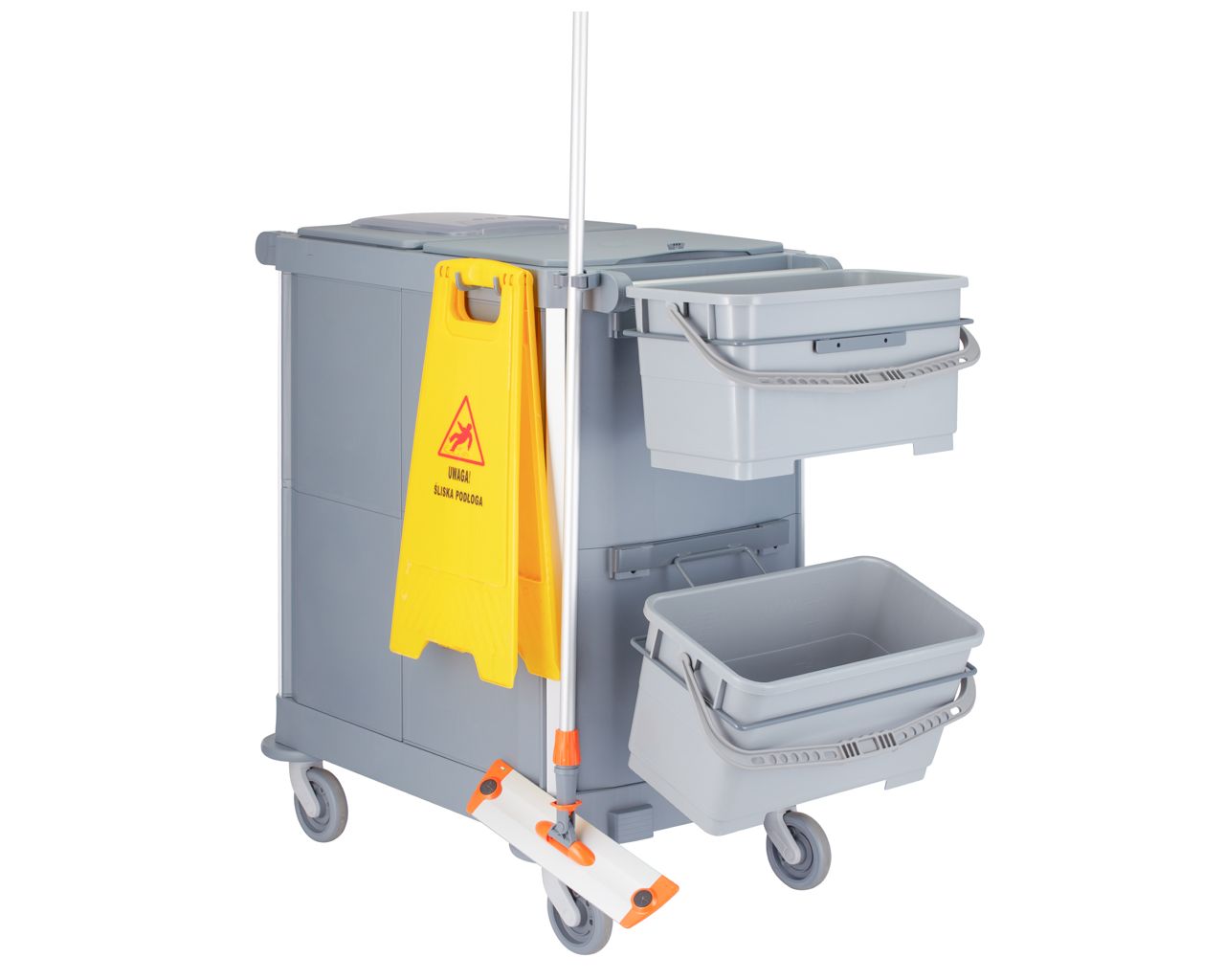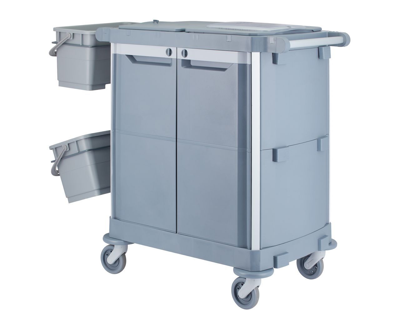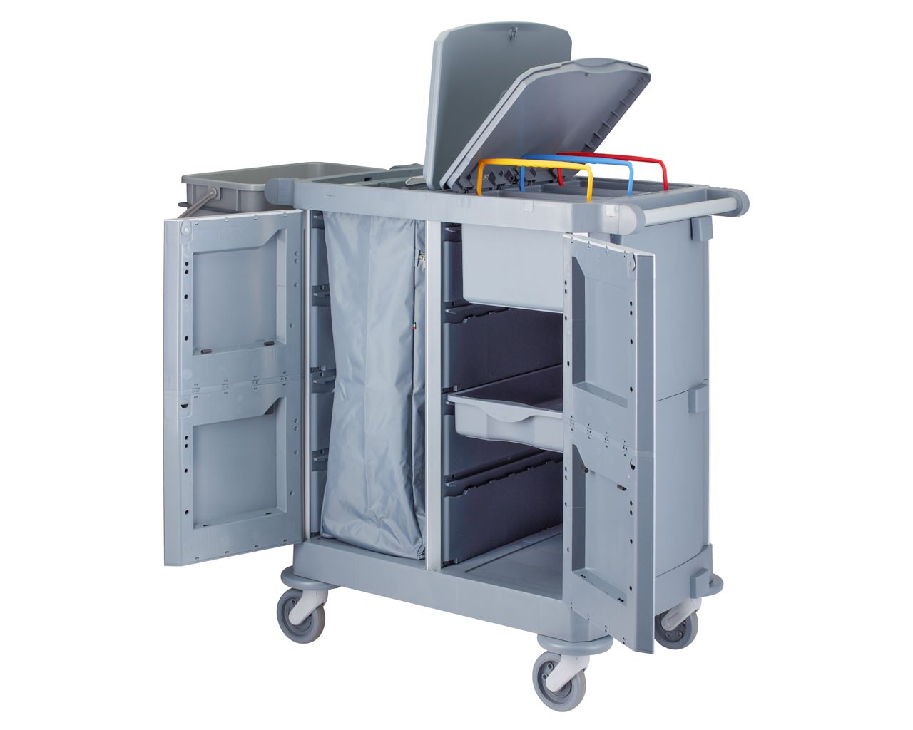 – wózek może być całkowicie zamykany za pomocą drzwi (zamykanych na klucz) i pokryw, co zapewnia maksymalne bezpieczeństwo i higienę, ukrywając detergenty i narzędzia